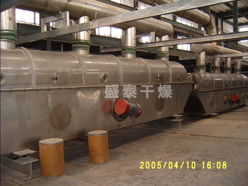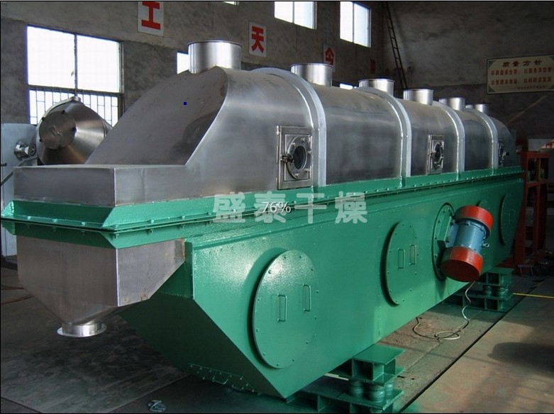 物料自進(jìn)料口進(jìn)入機(jī)內(nèi),在振動作用下,物料沿流化床水平方向拋擲向前連續(xù)運(yùn)動,熱風(fēng)向上穿過流化床同待處理物料進(jìn)行熱質(zhì)后,濕空氣經(jīng)旋風(fēng)分離器除塵后由排風(fēng)口排出,干燥物料由排料口排出。